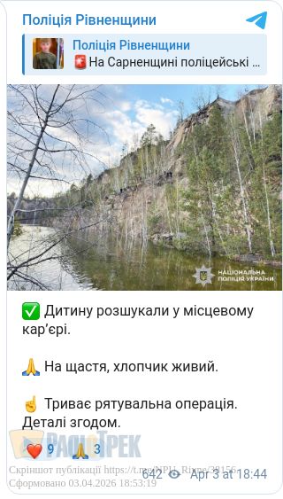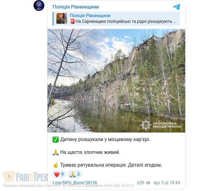 На Сарненщині знайшли зниклого 10-річного хлопчика. Наразі триває рятувальна операція, за попередньою інформацією, з дитиною все добре. Його виявили у місцевому кар’єрі.
