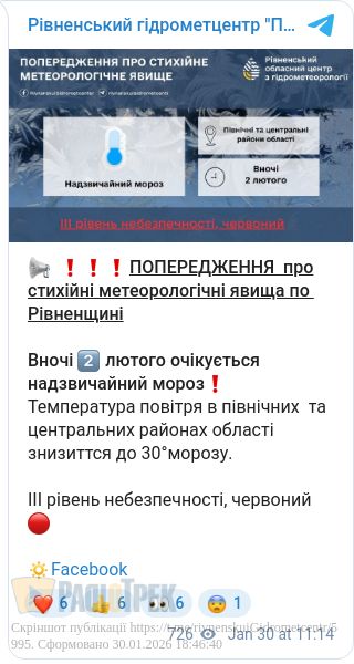 Вночі 2 лютого температура повітря опуститься до -30 градусів. Аномально низька температура повітря буде у північних та центральних районах області, повідомили у Рівненському обласному гідрометцентрі.