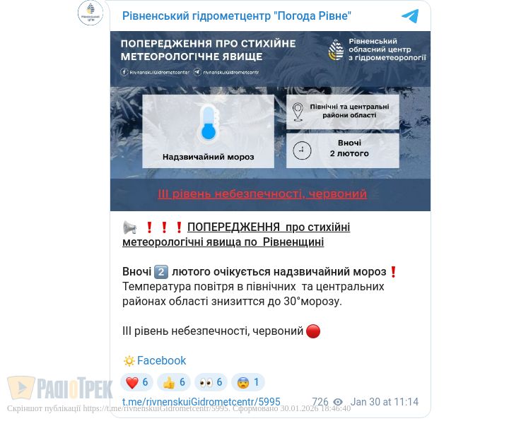 Вночі 2 лютого температура повітря опуститься до -30 градусів. Аномально низька температура повітря буде у північних та центральних районах області, повідомили у Рівненському обласному гідрометцентрі.