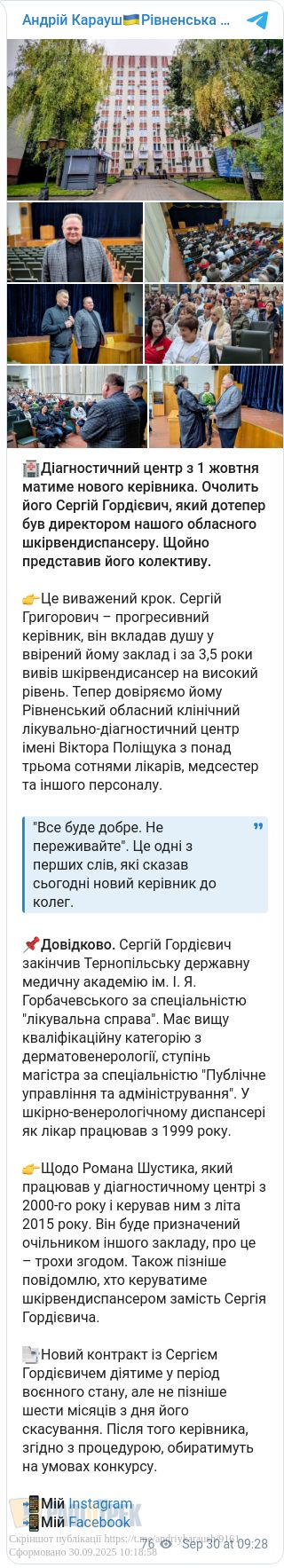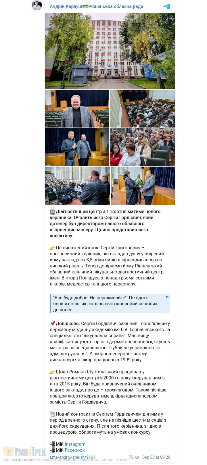 З 1 жовтня Рівненський обласний клінічний лікувально-діагностичний центр очолить Сергій Гордієвич. До цього він понад три роки керував обласним шкірно-венерологічним диспансером, де працював із 1999 року.