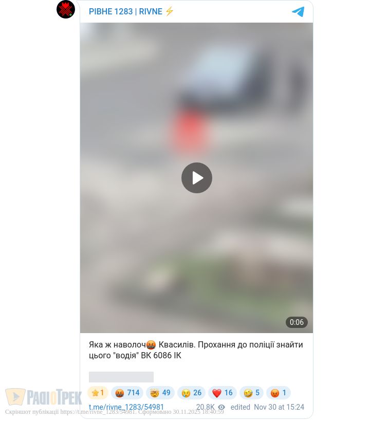 Сьогодні, 30 листопада, під час моніторингу соціальних мереж в одному з телеграм-каналів правоохоронці виявили відео, у якому невідомий на автомобілі, здійснив наїзд на собаку, повідомляють в ГУНП Рівненської області.