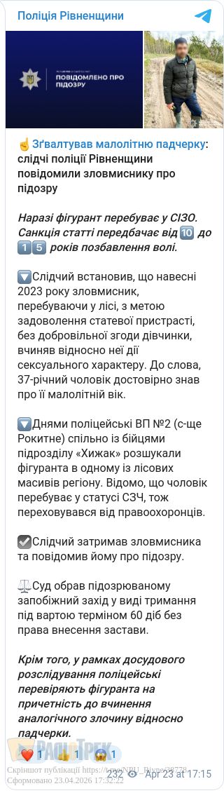 Слідчий встановив, що навесні 2023 року зловмисник, перебуваючи у лісі, з метою задоволення статевої пристрасті, без добровільної згоди дівчинки, вчиняв відносно неї дії сексуального характеру. До слова, 37-річний чоловік достовірно знав про її малолітній вік.