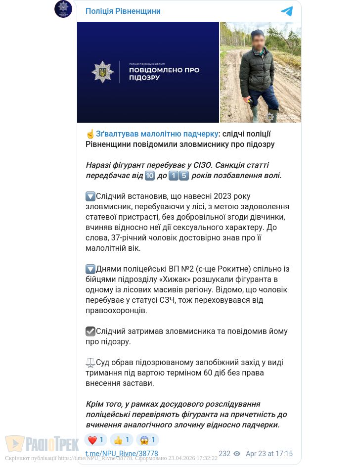 Зґвалтував малолітню падчерку: слідчі поліції Рівненщини повідомили зловмиснику про підозру