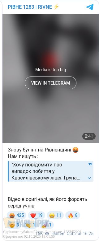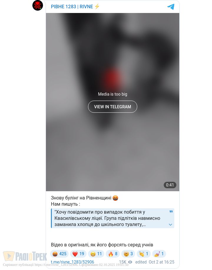 Сьогодні, 2 жовтня, під час моніторингу соціальних мереж правоохоронці виявили відео, де у вбиральні одного із навчальних закладів Квасилова неповнолітній завдає удари руками та ногами по голові та тілу іншого хлопця.