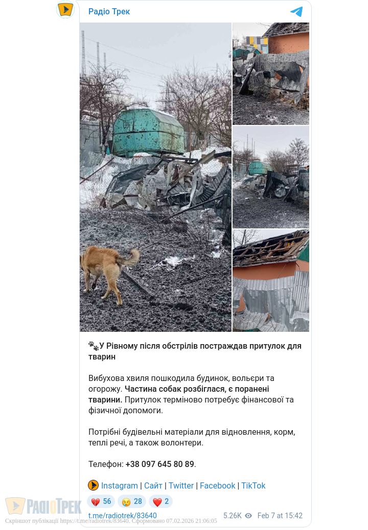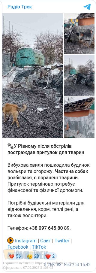 У FB групі «Зоопульс.Рівне» повідомляють про те, що внаслідок ворожої атаки на Рівненщину було пошкоджено притулок для тварин.