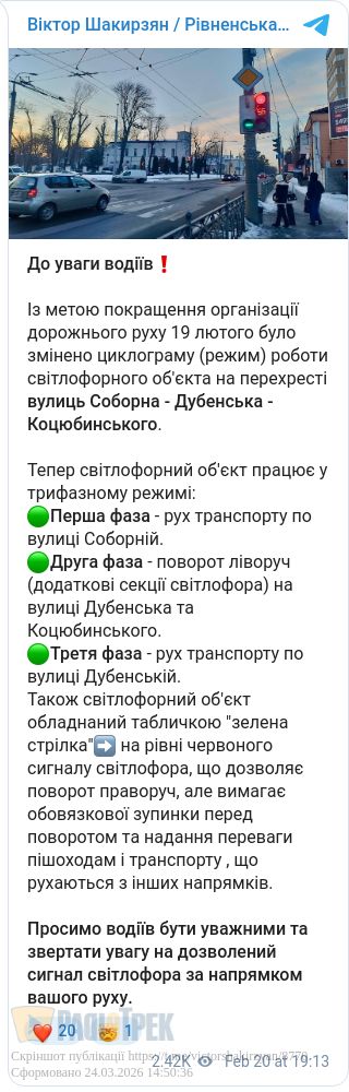 Нагадаємо, новий світлофор на перехресті презентував секретар Рівнеради Віктор Шакирзян у своєму Телеграмі. Його встановили наприкінці лютого і у соцмережах багато водіїв нарікали на новацію, бо час очікування у заторі навпаки збільшився.