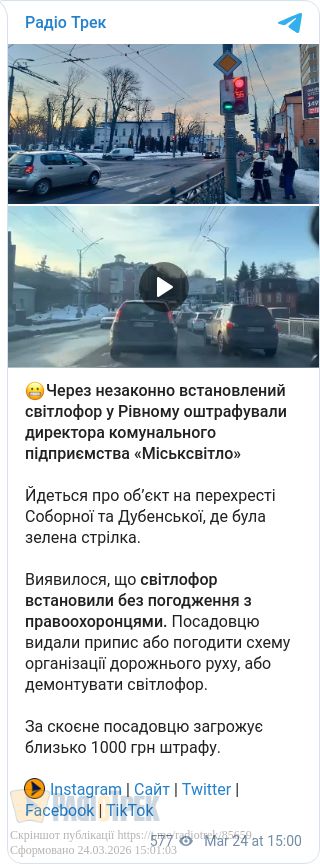 Через незаконно встановлений світлофор у Рівному оштрафували директора комунального підприємства «Міськсвітло». Йдеться про об’єкт на перехресті Соборної та Дубенської, де була зелена стрілка.