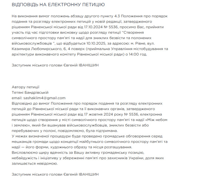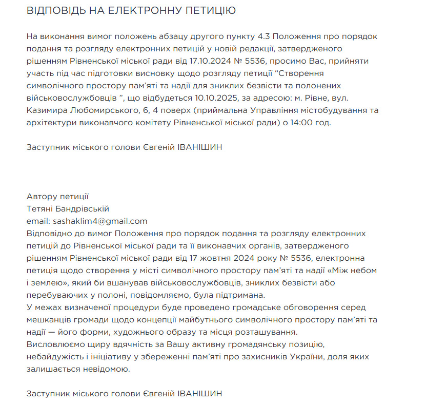 Днями на петицію відреагувала влада, на сайті відповіли, що проведуть громадське обговорення щодо концепції, форми та розташування проєкту.