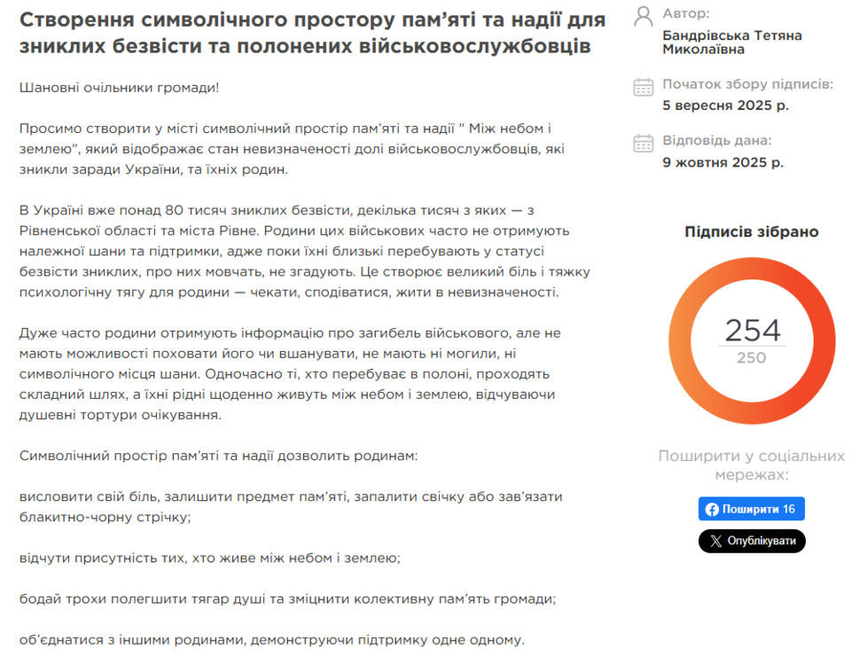 У Рівному пропонують створити символічний простір пам’яті «Між небом і землею» для вшанування зниклих безвісти та полонених військовослужбовців. Петицію на сайті міськради швидко підтримали рівняни і вона за кілька днів набрала необхідну кількість голосів.