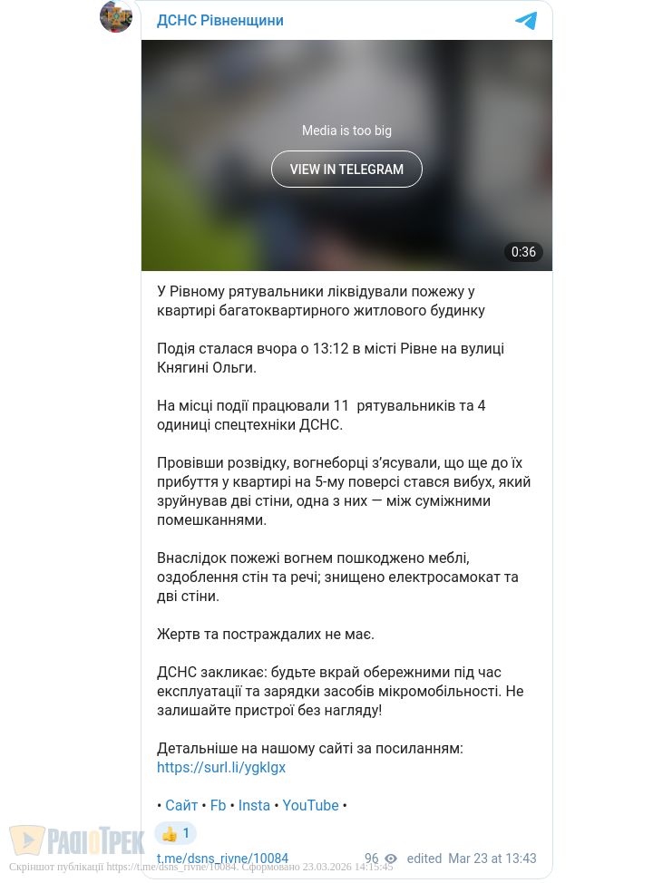 Вибух стався у багатоповерхівці на вулиці Княгині Ольги у Рівному. Він зруйнував стіну між сусідніми квартирами на 5 поверсі. Після цього виникла пожежа.
