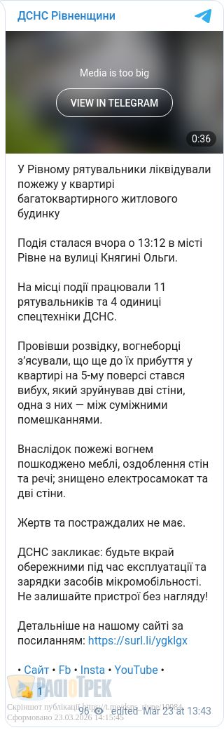 Як повідомили Радіо ТРЕК у прес-службі ДСНС області, попередньою причиною інциденту стало замикання батареї електросамоката. Минулося без потерпілих.