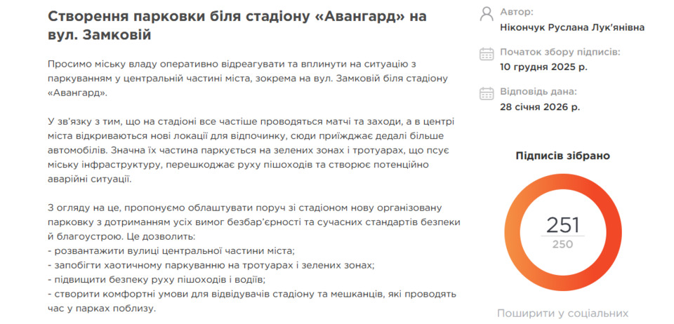 У зверненні йшлося про проблему хаотичного паркування під час матчів і масових заходів — автомобілі залишають на тротуарах і зелених зонах, що заважає пішоходам і створює небезпеку.
