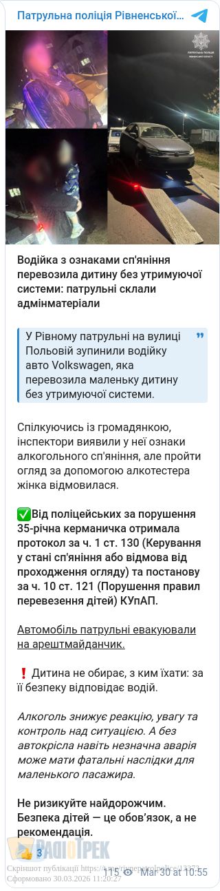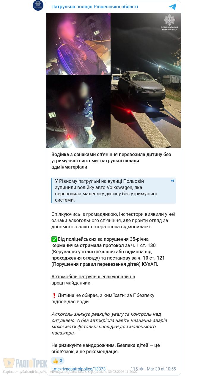 П’яну водійку, яка везла дитину, виявили поліцейські у Рівному. Інцидент стався напередодні, на вулиці Польовій.