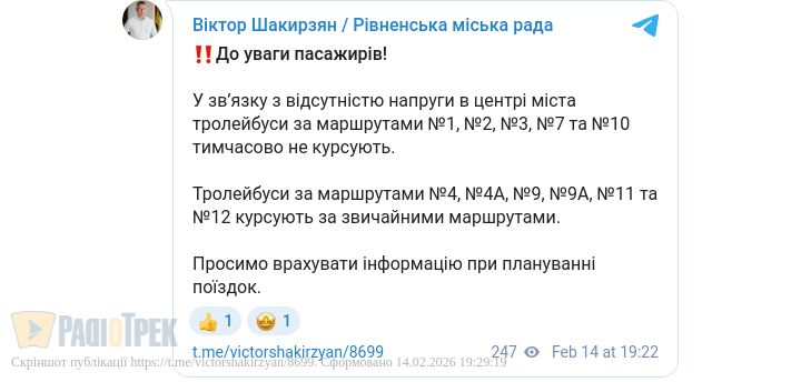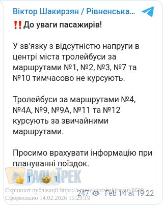 У центрі Рівного немає напруги. Нині частина тролейбусів не курсує.