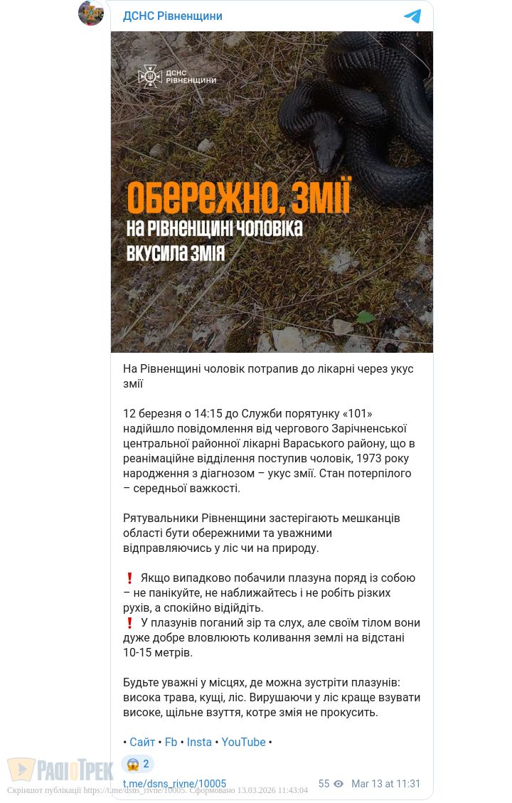 Перший у цьому році випадок укусу змії зареєстрували на Рівненщині. Вчора до реанімації Зарічненської лікарні госпіталізували 52-річного потерпілого.