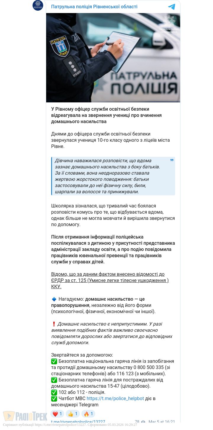 Учениця 10 класу у Рівному повідомила офіцерці служби освітньої безпеки про домашнє насильство. Дівчина розповіла, що потерпає від знущань – батьки неодноразово застосовували до неї фізичну силу, били, шарпали за волосся та принижували. Інформацію передали ювенальній превенції і службі у справах дітей.