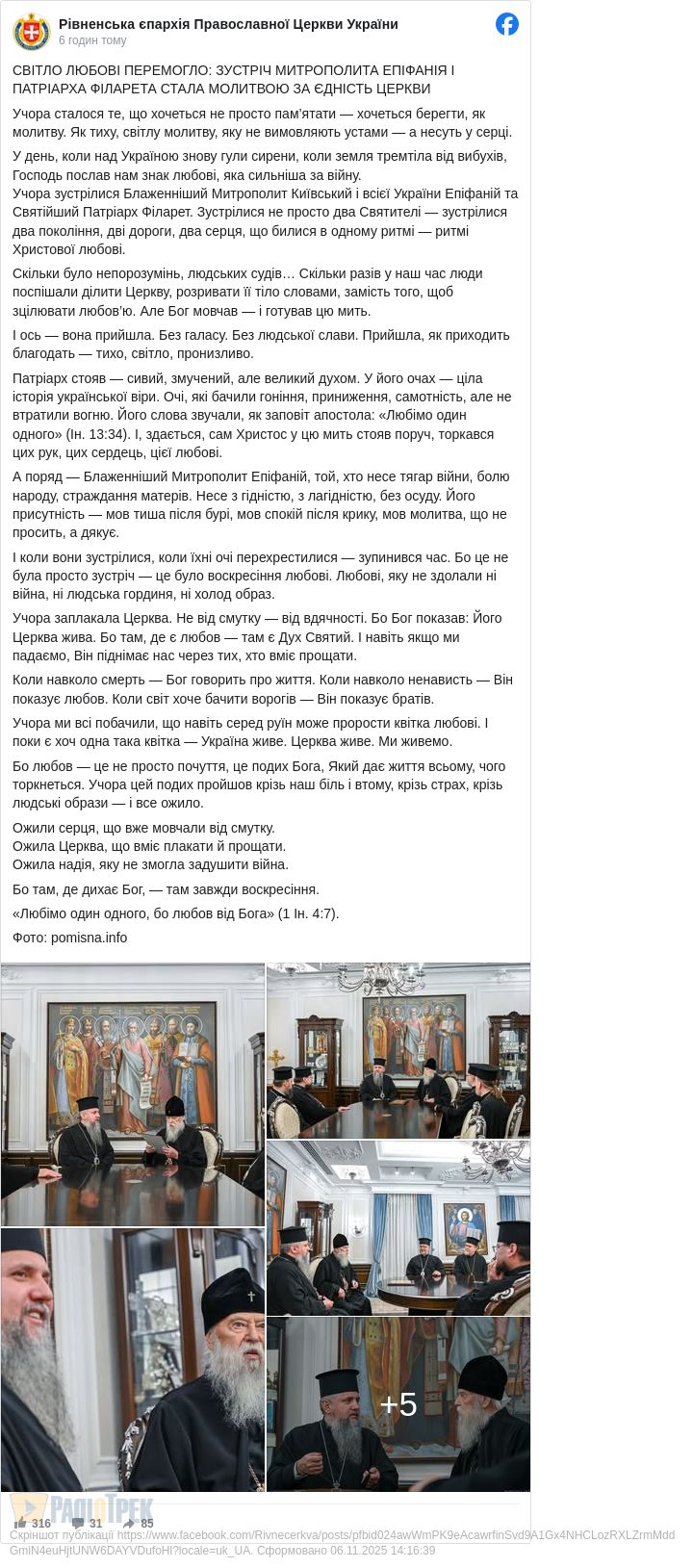 Не виключено, що в цей день Митрополит Епіфаній та Патріарх Філарет приїдуть до Рівного разом