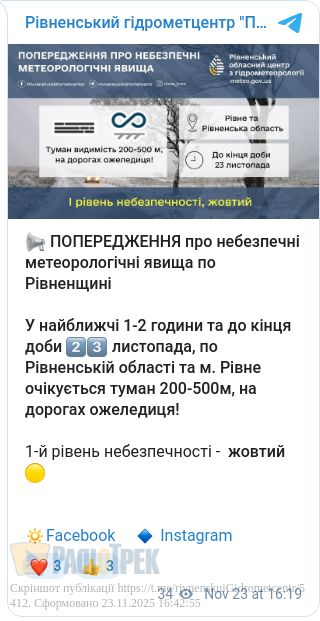 Синоптики Рівненського обласного гідрометцентру попереджають про туман 200-500 м та ожеледицю на дорогах.