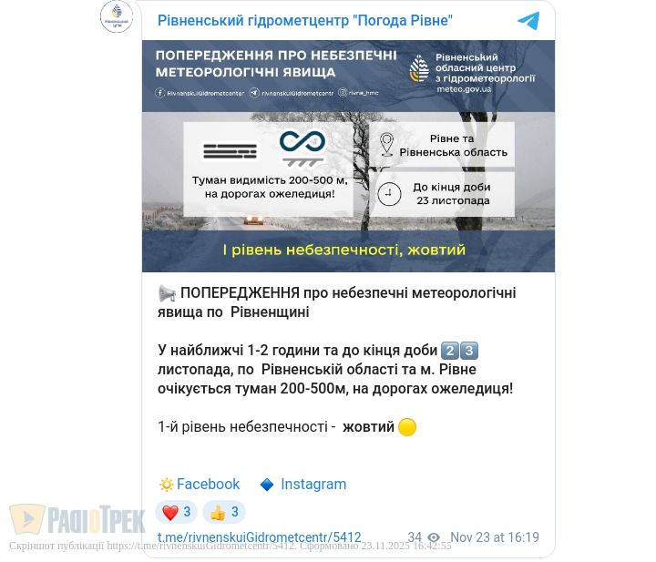 Синоптики Рівненського обласного гідрометцентру попереджають про туман 200-500 м та ожеледицю на дорогах.