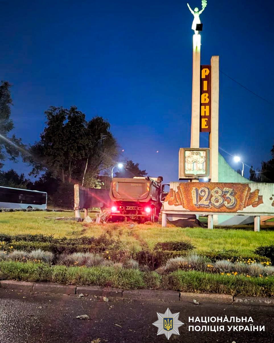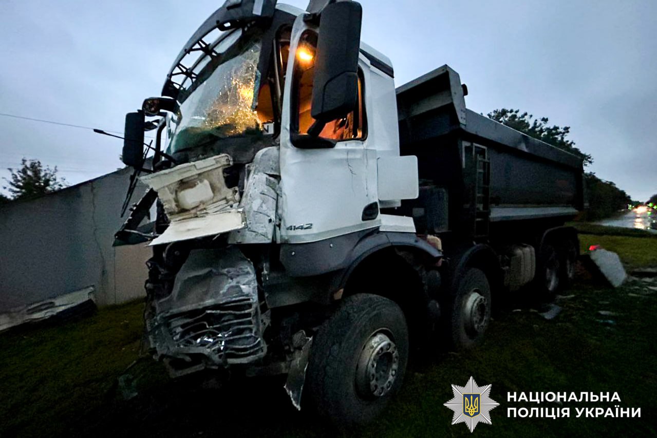 Слідчий попередньо встановив, що водій автомобіля «Mercedes-Benz Arocs», 44-річний житель Житомирської області, рухаючись на кільцевому перехресті, проявив неуважність, не впорався з керуванням та здійснив наїзд на бетонну стелу.