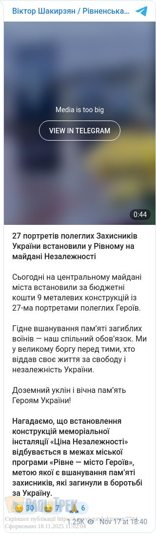На Майдані Незалежності у Рівному доповнили меморіальну інсталяцію «Ціна Незалежності». Там встановили ще 27 портретів Героїв, які загинули у війні проти росії, захищаючи свободу та територіальну цілісність України.