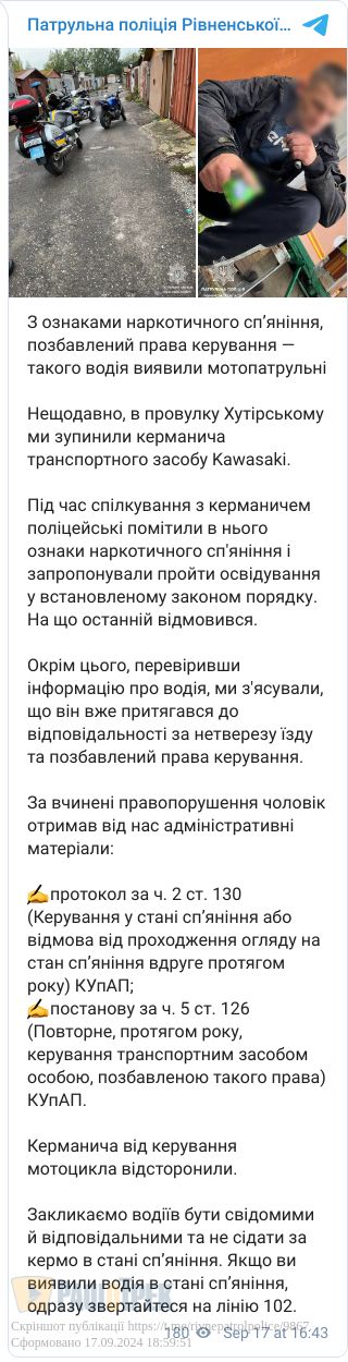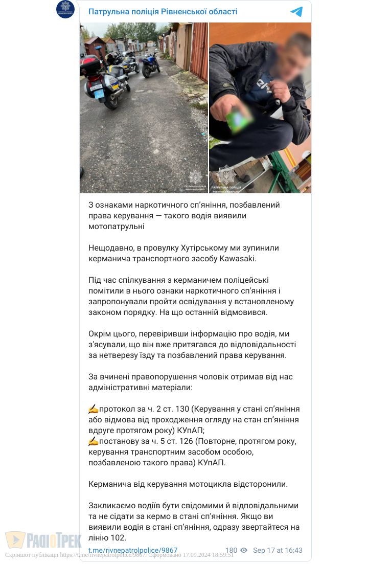 Водія з ознаками наркотичного сп’яніння спіймали у Рівному. Напередодні патрульні в провулку Хутірському зупинили кермувальника мотоцикла Kawasaki.