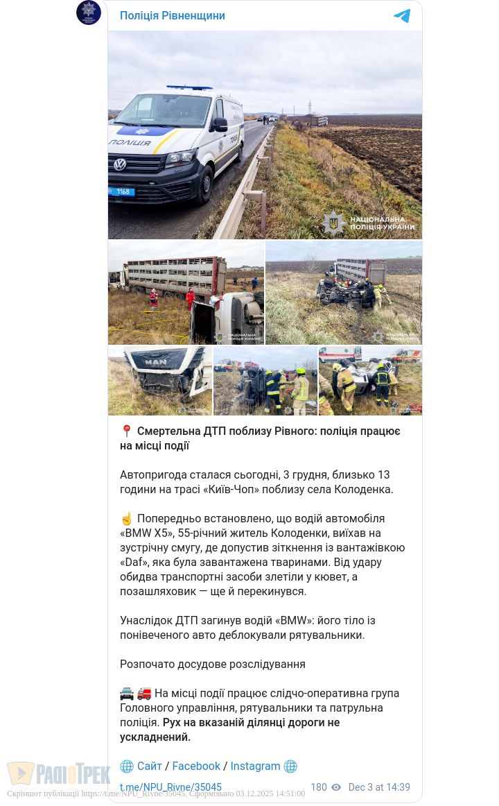 Смертельна ДТП сталася дві години тому поблизу Рівного на трасі Київ-Чоп біля села Колоденка (це на об’їзній м. Рівне).