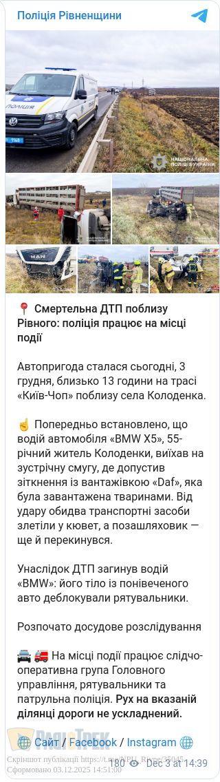 Водій BMW X5 виїхав на зустрічну смугу і зіткнувся з вантажівкою Daf із тваринами.