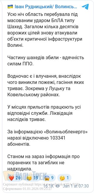Усю ніч сусідня Волинь перебувала під масованим ударом БпЛА типу Шахед.