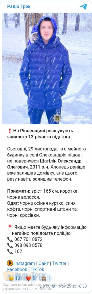 До поліції 29 листопада, надійшло повідомлення про зникнення вихованця будинку сімейного типу: близько 11:30 хлопець пішов з дому і не повернувся вихованець.