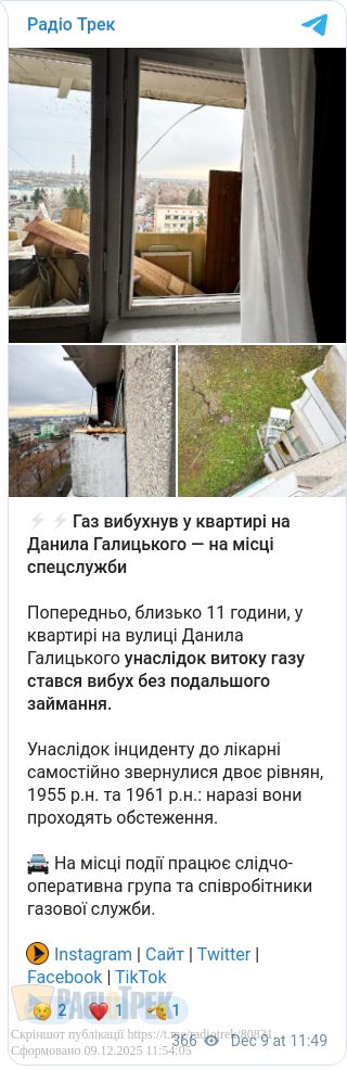 Попередньо, близько 11 години, у квартирі на вулиці Данила Галицького унаслідок витоку газу стався вибух без подальшого займання.