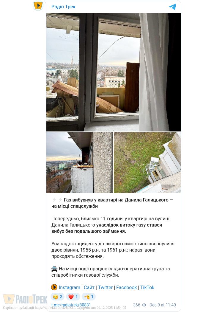Попередньо, близько 11 години, у квартирі на вулиці Данила Галицького унаслідок витоку газу стався вибух без подальшого займання.