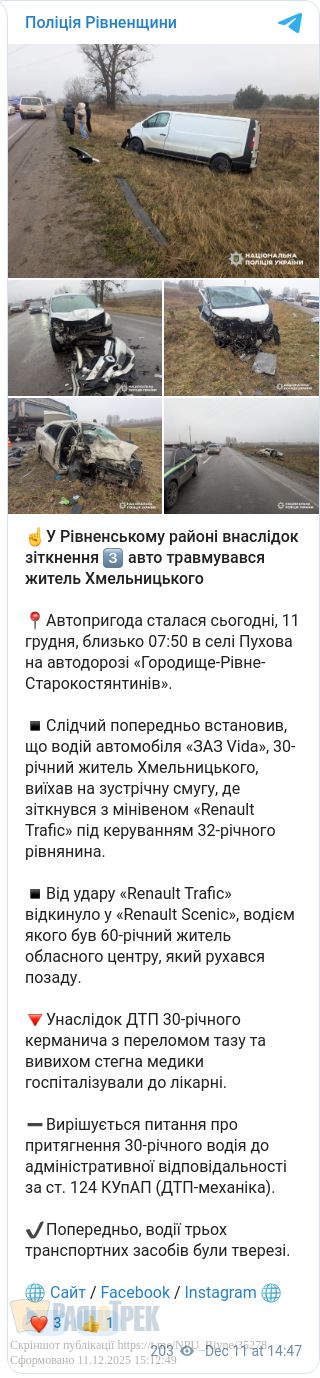 ДТП за участі трьох автомобілів сталася сьогодні вранці у селі Пухова біля Рівного. Правоохоронці встановили, що 30-річний житель Хмельницького виїхав на зустрічну смугу та зіткнувся з мікроавтобусом «Renault Trafic». Той внаслідок удару влетів у ще один легковик.