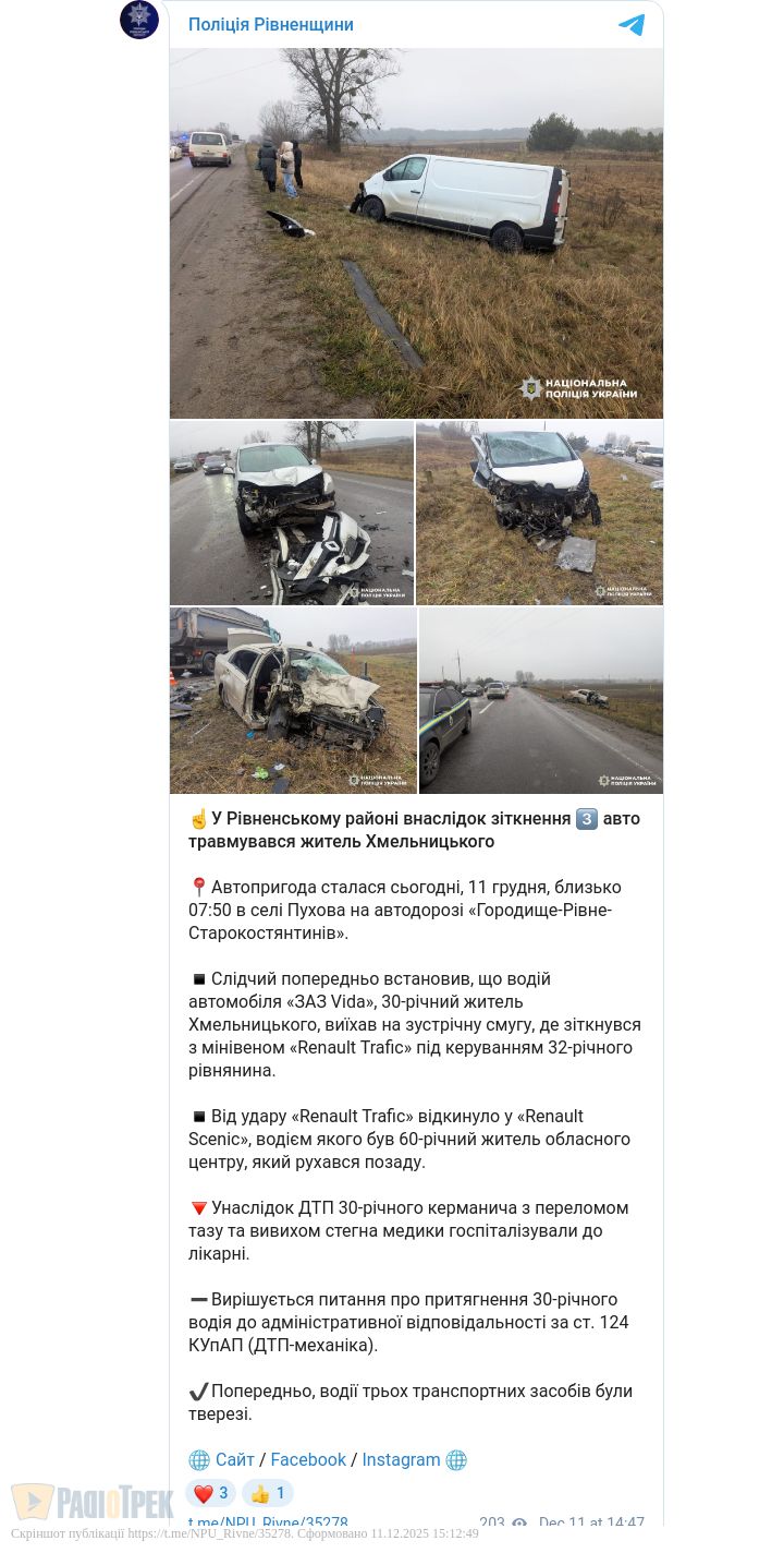 ДТП за участі трьох автомобілів сталася сьогодні вранці у селі Пухова біля Рівного. Правоохоронці встановили, що 30-річний житель Хмельницького виїхав на зустрічну смугу та зіткнувся з мікроавтобусом «Renault Trafic». Той внаслідок удару влетів у ще один легковик.