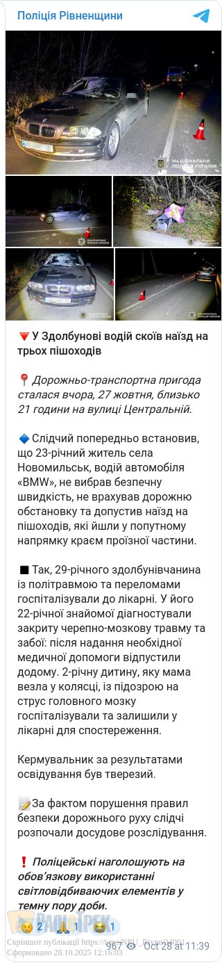 У Здолбунові водій BMW на швидкості збив трьох пішоходів, серед яких була 2-річна дівчинка у візочку.