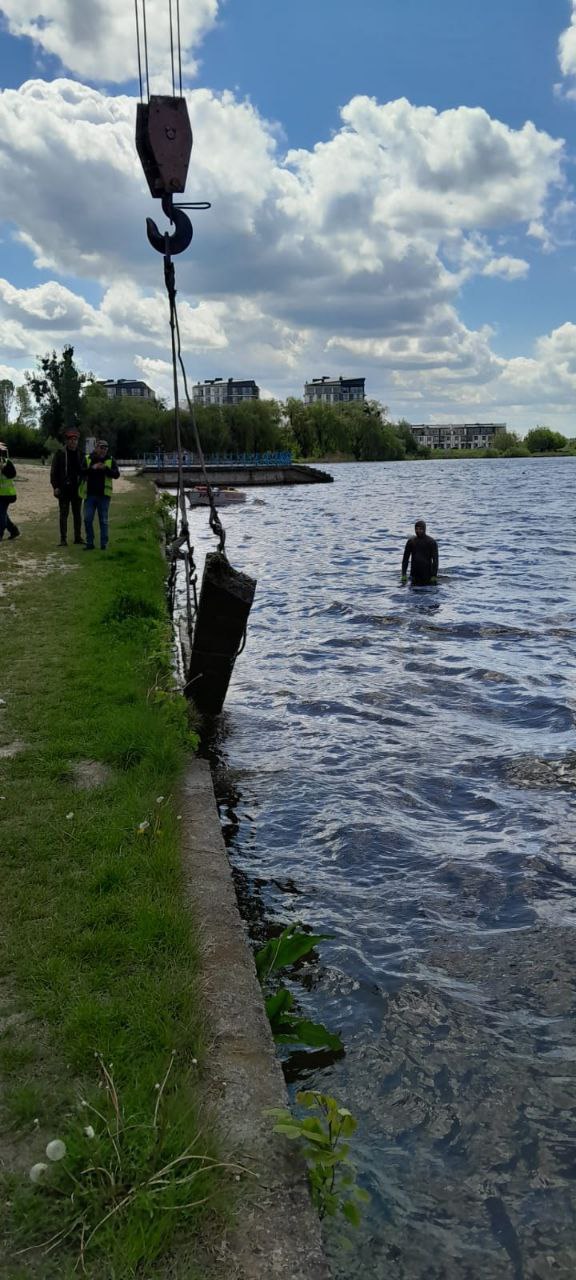 На фото ви самі можете побачити, яке залізяччя стирчало догори. Підняти цю бетонну частину, що відвалилась від берегової конструкції, допомогли комунальники з Тресту зеленого господарства. Після цього водолази завершили кількаденну роботу з очищення дна біля міського пляжу.