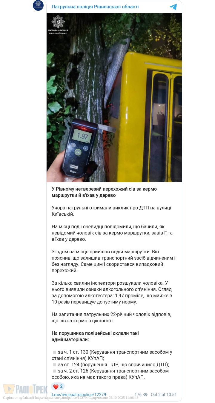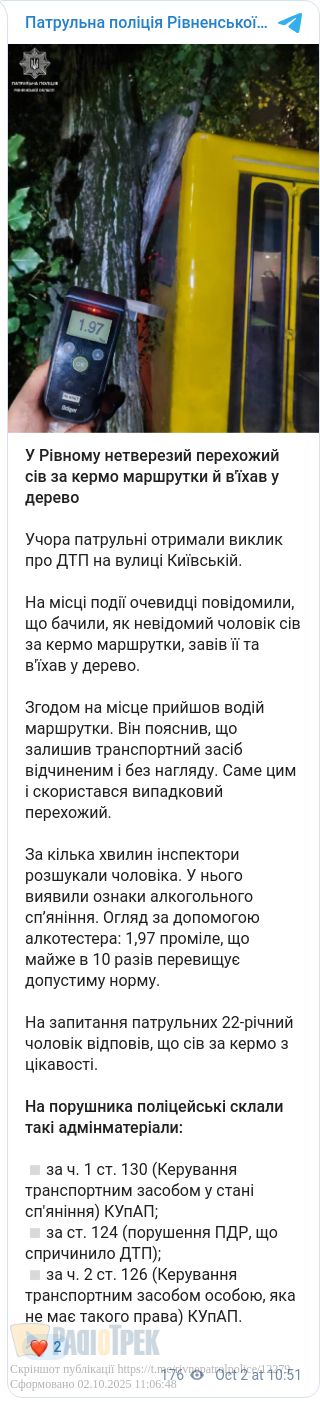Огляд на стан сп’яніння показав майже 2 проміле. Тепер допитливому молодику загрожує понад 20 тисяч гривень штрафу.