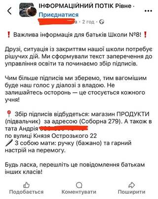 У соцмережах рівненських груп поширюють інформацію про нібито закриття ліцею №8 на Ювілейному.