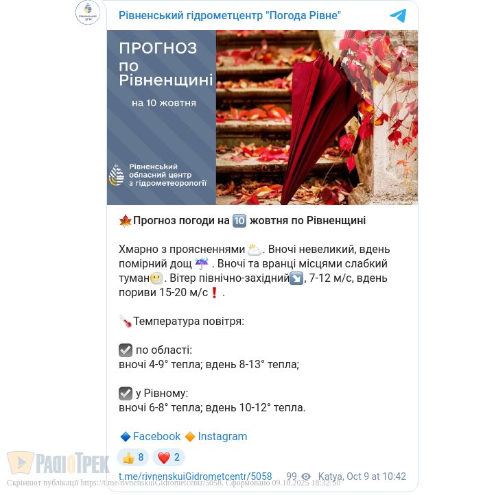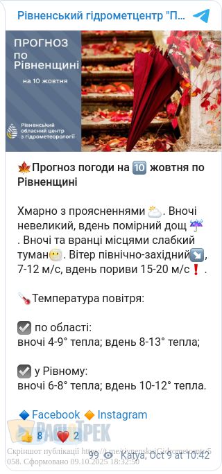 Завтра, 10 жовтня, на Рівненщині очікується хмарна погода з проясненнями.