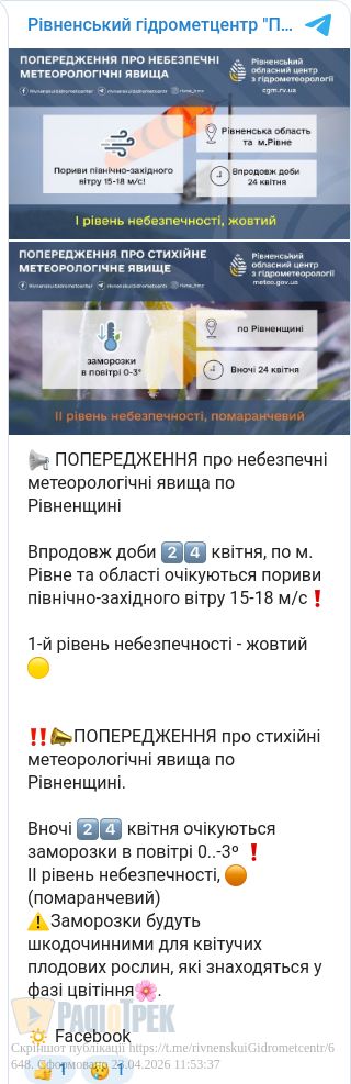 Завтра, 24 квітня, у Рівному та області буде очікується сильний вітер та заморозки.