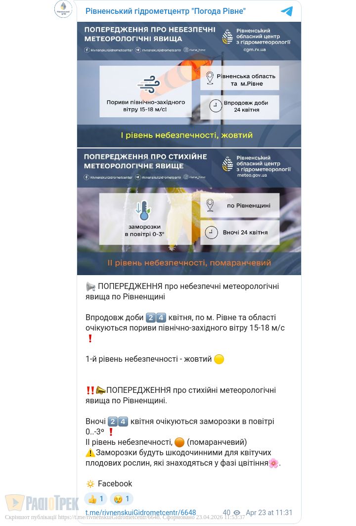 У зв’язку з цим в області оголосили «жовтий» та «помаранчевий» рівні небезпеки, повідомили у Рівненському обласному гідрометцентрі.