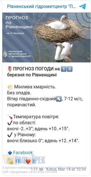Завтра, 15 березня, у Рівному та області буде мінлива хмарність.