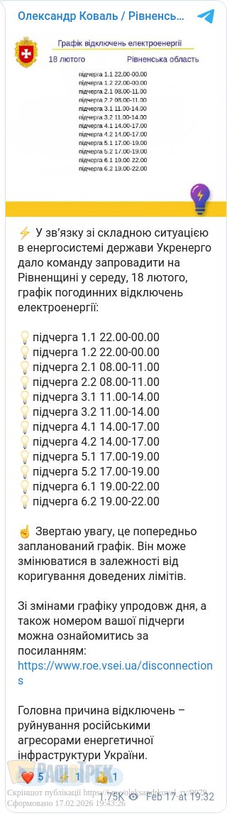 Якщо станеться аварія, планові відключення не діятимуть. Зі змінами графіка упродовж дня, а також номером вашої підчерги, можна ознайомитись на сайті Рівнеобленерго.